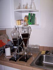 Fast forward 14 years. An acquaintance working and living in Japan went on holiday and discovered a bar with this exceptionally beautiful rig for the preparation of Viennese Triple Cold Extraction Coffee. Upon sampling this, he felt that, and I quote, “I could see colors that weren’t in the visible spectrum, and could vibrate through walls.” I looked at this I said to myself, “Hey, you’ve got enough virgin laboratory glassware lying around the house that you could probably build something like that.” Probably several somethings, actually, but that’s beside the point.
