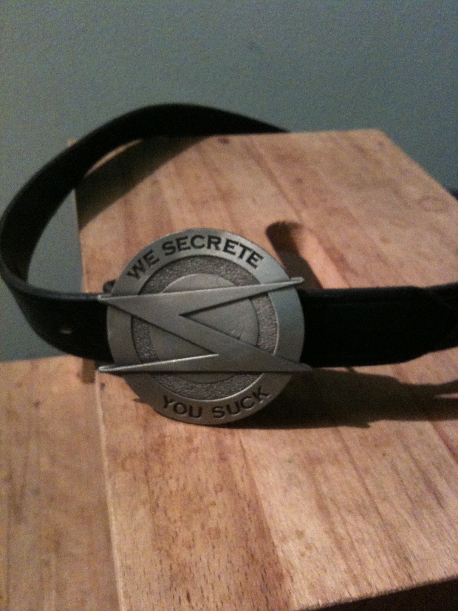 When he showed up in the Ratmobile, he gave me a Secretions belt buckle in thanks. Mickie, thank you much for keeping my pants off the ground in the event of the A to Z alien/zombie attack. Oh, and for some mighty fine punk music too. I find it is necessary to have angry music to do math properly and The Secretions make the equations flow for me.
