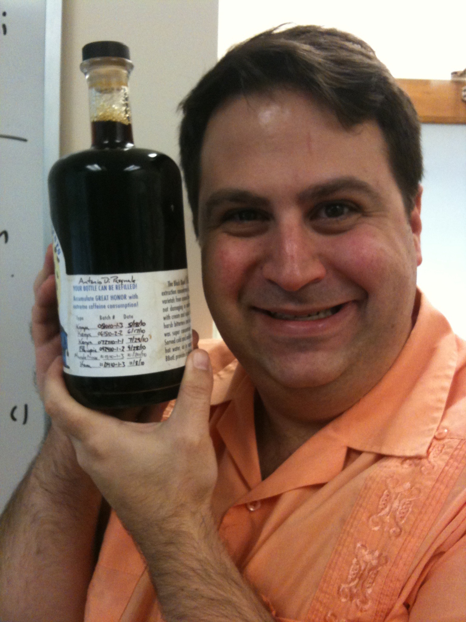 A toast to Antonio!  (The smile lets you know he senses your fear.  Back away slowly and leave the coffee and/or booze on the ground.  Do not take your eyes off his or he will attack.  If he bares fangs, run.)