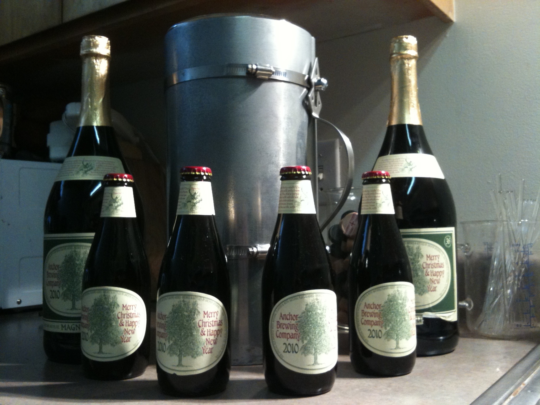 STEP 2: Procure 4.3L of beer.  Done.  In honor of the holiday and to maintain local pride, I have chosen to go with Anchor Steam’s 2010 Christmas Ale.  The fact that it’s tasty doesn’t hurt.  Here is the pre-experiment set up: