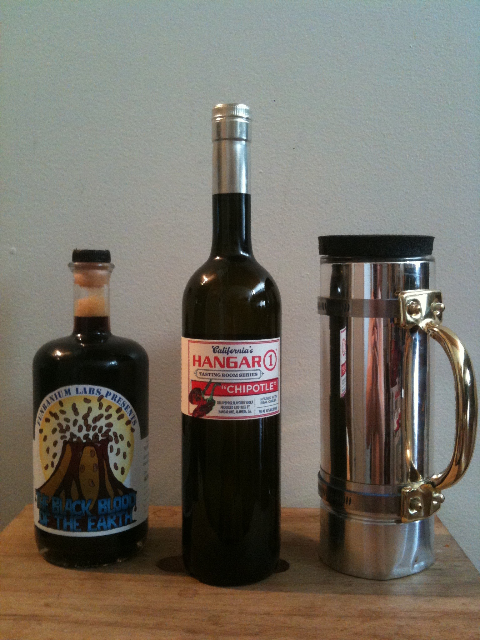 Lastly, the kids at St. George Spirits have released a new batch of the Hangar One chipotle vodka. In addition to being a happy consumer of their wares, I also do my best to keep the place humming with Black Blood of the Earth. The benefit to this is that the distillery crew are inveterate, compulsive bartenders and have a hard time not tinkering with any ingredients lying around. Now that the chipotle vodka is back, the world may once more drink “Andie’s Breakfast”: